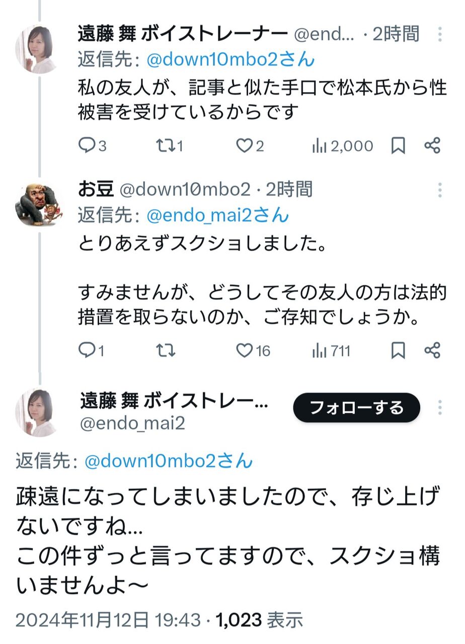 読者からさまざまな反応が寄せられる中で、遠藤さんは12日に、女性から寄せられた投稿に返信する形で「私も女性であり、セクハラや性被害を受けてきましたが美人局や冤罪は許さないという考えの持ち主です。説明が追いついていませんが私の直の友人が松本氏らからホテルで性被害を受けています」と投稿。「似た内容の記事が文春から出て、揉み消されそうになっているのを見て、いてもたってもいられず、で今です」と告白した。